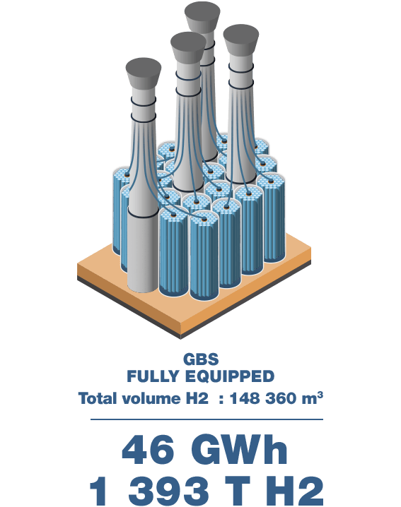 GBS oil platforms with very large volumes to store a considerable amount of energy of green H2.